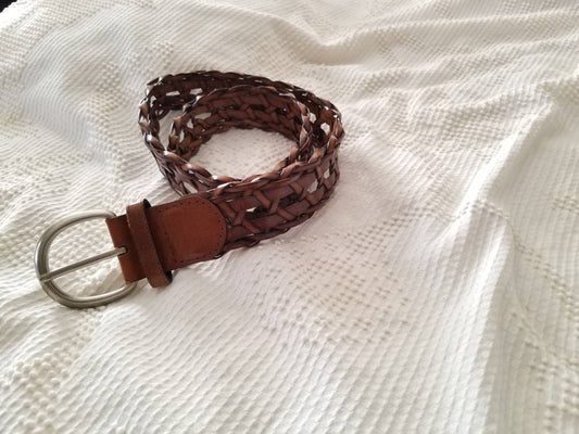 Vintage Braided Belt / Genuine Leather / Thick / Wide / Woven / Silver Buckle / Small/ Medium / Brown / Bonded / 2" / Classic / Women / Boho
