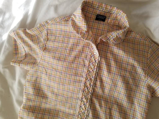 Vintage blouse, stripe, plaid, Moving Up, L, short sleeves, pastels, Easter colors, lace trim, button up front, spring, collar, casual shirt