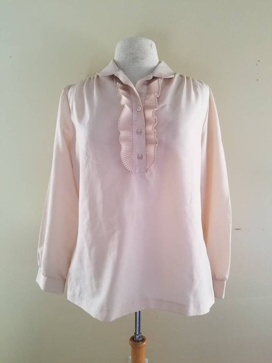 Vintage blouse, pink, long sleeves, straight collar, pleated, button up front, polyester, casual, fancy dressy, M L, 80s, layer, bust seams