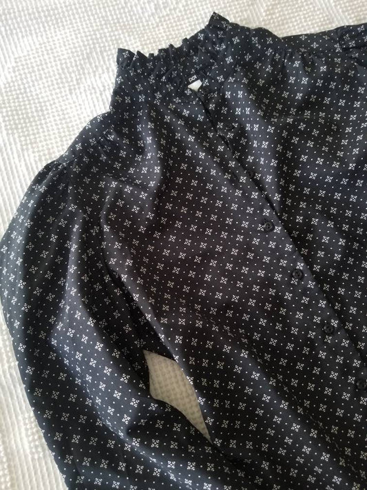 Vintage blouse, Pant Her, 13/14, shirt, button up front, long sleeves, black, white dots, ruffle neck, 70s, dressy, casual, feminine, top
