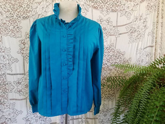 Vintage blouse, Josephine, 14, teal, long sleeves, vibrant, 70s, button up front, pleated, ruffled collar, puff sleeves, covered buttons