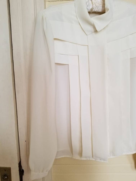 Vintage blouse, Steven Barry, 8, long sleeves, white, pleated, button up, collar, polyester, dressy, fancy, flowy, workwear, boss lady shirt