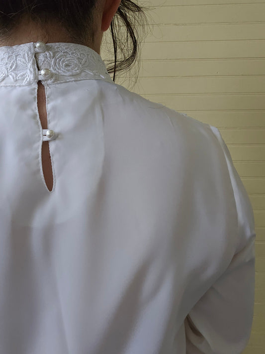 Vintage blouse, Eva Laurel Petite 8 white long sleeve 80s collar fancy dressy shirt pearl buttons mock neck floral lace pleated Victorian