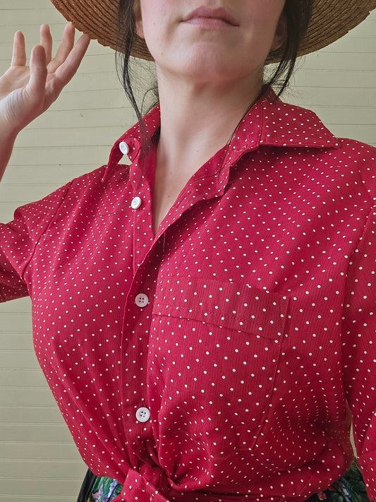 Vintage blouse, Blair medium red white polka dots button up front collar short sleeves pocket casual shirt 80s 90s women flirty retro pinup