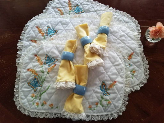 Vintage table setting, placemats, napkins, napkin rings, embroidered, set of 12, lace, floral, handmade, yellow blue white, granny chic, 70s