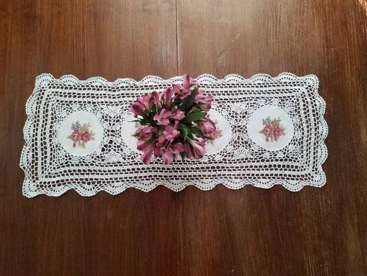Vintage table runner, crochet floral embroidered white scallops rectangle table topper granny chic grandmillennial Victorian cottagecore