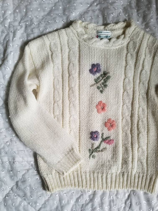 Vintage sweater, Currants medium white pink floral embroidered long sleeves crew neck cottagecore knit pullover braided pattern cosy ribbed