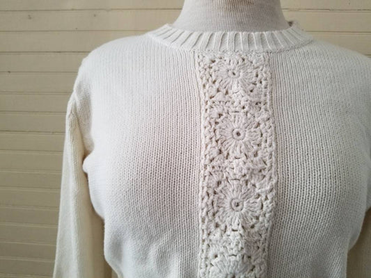 Vintage sweater, white crochet doily floral design knit long sleeve crew neck pullover cottagecore granny grandmillennial simple ribbed M