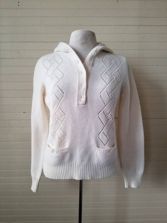 Vintage sweater, Jones New York white pullover hooded long sleeves knit button up pockets braided ribbed floral medium women cottagecore