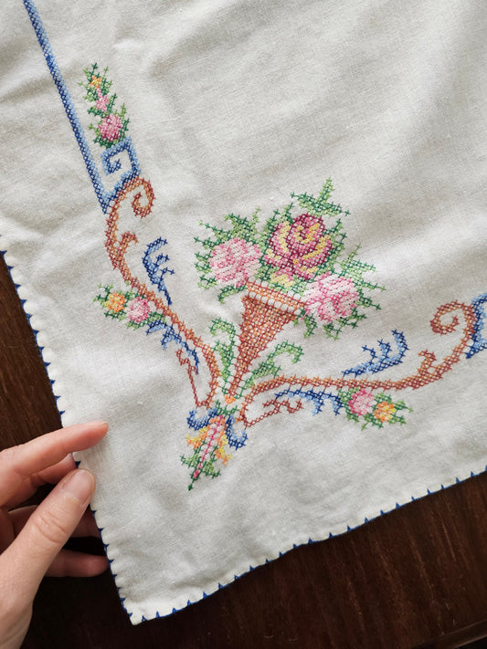 Vintage table linens, set of 5 handmade embroidered cross stitch tablecloth napkins floral square topper small granny cottagecore Victorian