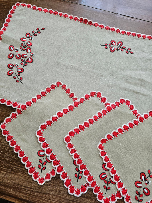 Vintage table linens, set of 5 napkins table runner handmade crochet embroidered red white black floral 70s MCM retro hippy boho bohemian