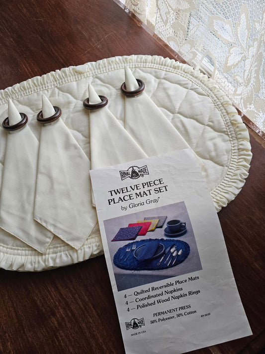 Vintage table linen set, Royal Made white set of 12 quilted placemats napkins wood napkin rings brand new unused oval cottagecore country