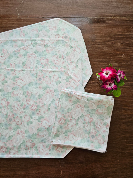 Vintage table setting, set of 8 placemats napkins floral pink green new unused cottagecore country farmhouse granny shabby grandmillennial