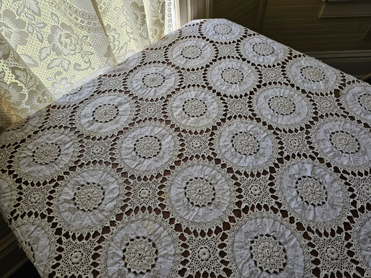 Vintage tablecloth beige rectangle crochet medallion embroidered floral doily granny shabby chic country farmhouse Victorian grandmillennial