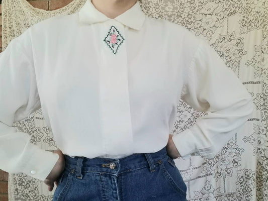 Vintage White Blouse / Just Maggie / Small / Long Sleeves / Collared / Embroidered / Floral / Rose / Dressy / Button Up Shirt / Rayon