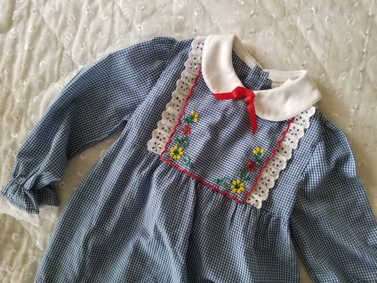 Vintage toddler dress, 6X, girl, long sleeves, gingham, blue, floral, white lace, Peter Pan collar, tiered, ruffle, red, bib, maxi, 70s,
