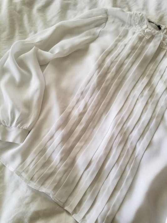 Vintage white blouse, long sleeves, pleat, lace, collar, dressy, fancy, granny chic, cottagecore, floral, 80s 90s, feminine, crew neck, poet