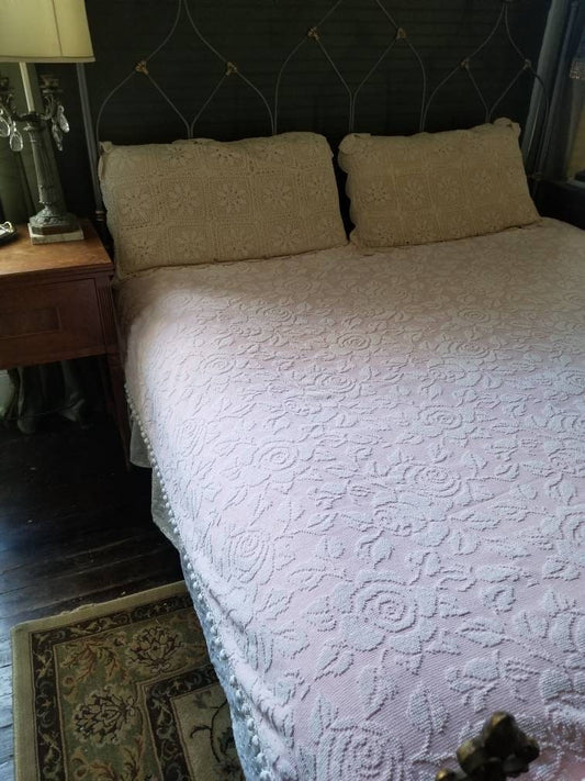 Vintage chenille, bedspread blanket queen hobnail pink white pom fringe cottagecore shabby granny grandmillennial country farmhouse cotton