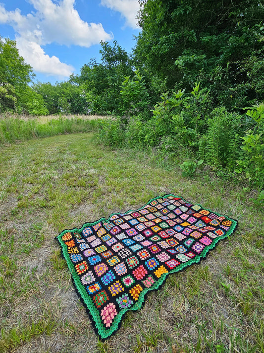Vintage blanket, crochet handmade multicolored 70s scallops lap small afghan throw retro granny chic hippy granny square rectangle nursery