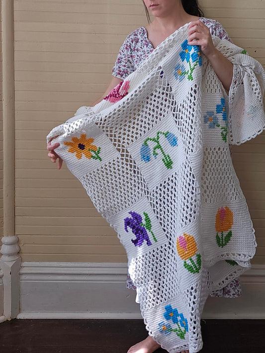 Vintage blanket, handmade crochet floral wildflowers rectangle white bright throw afghan cottagecore granny chic lap coverlet patchwork