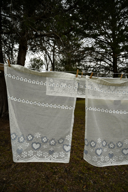 Vintage curtains set of 5 half cafe valance short kitchen panels lace white blue heart floral Louis Hornick and Co 1988 cottagecore country farmhouse granny shabby grandmillennial