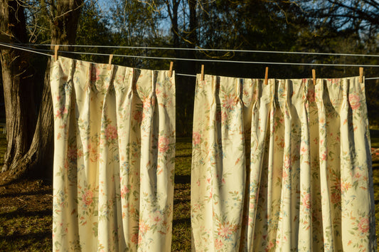 Vintage curtains, Lady Pepperell 84" set of 4 pinch pleat panel floral beige pink green lined cottagecore shabby granny grandmillennial MCM