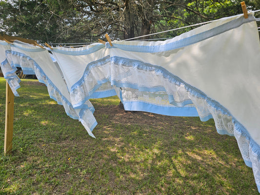 Vintage curtains, set of 8 cafe half swag valance tiered kitchen lace ruffle white blue house church country farmhouse cottagecore pastoral