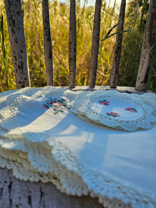 Vintage table setting, set of 16 placemats coasters white oval round crochet lace trim embroidered floral romantic feminine country farmhouse cottagecore granny chic shabby chic