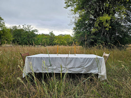 Vintage tablecloth, embroidered rectangle white green brown neutral natural flowers butterflies floral garden scene bow cottagecore country farmhouse