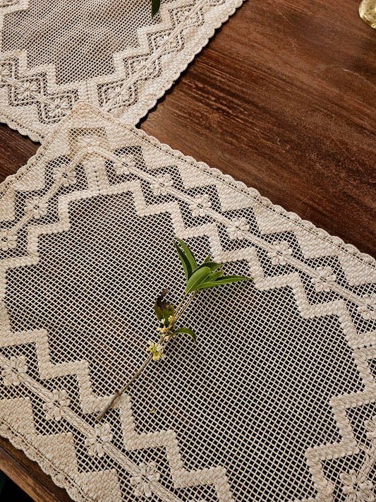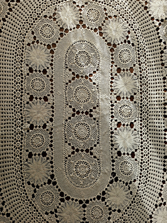 Vintage tablecloth, crochet beige oval oblong medallion lace cotton doily cottagecore Victorian grandmillennial granny shabby country farmhouse