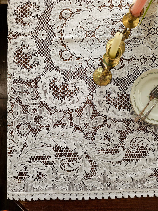 Vintage tablecloth, white lace rectangle floral paisley small cottagecore Victorian granny shabby chic boho bohemian country farmhouse