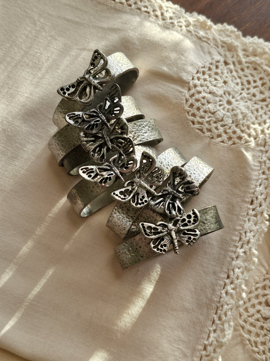 Vintage napkin rings Metzke Inc 1975 stamped signed antiqued pewter butterfly set of 7 original box cottagecore Victorian hammered metal