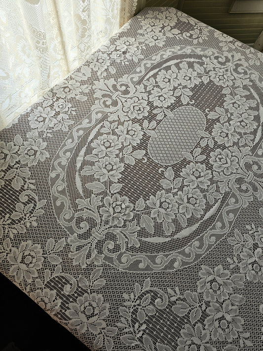 Vintage tablecloth lace white oval oblong floral paisley scallop edge polyester cottagecore grandmillennial granny shabby chic Victorian style romantic country farmhouse wedding bridal