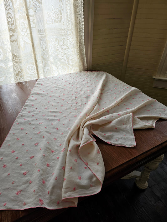 Vintage tablecloth large rectangle embroidered floral vine ivy leaf magenta pink peach green country farmhouse fairytale romantic cottagecore granny shabby chic