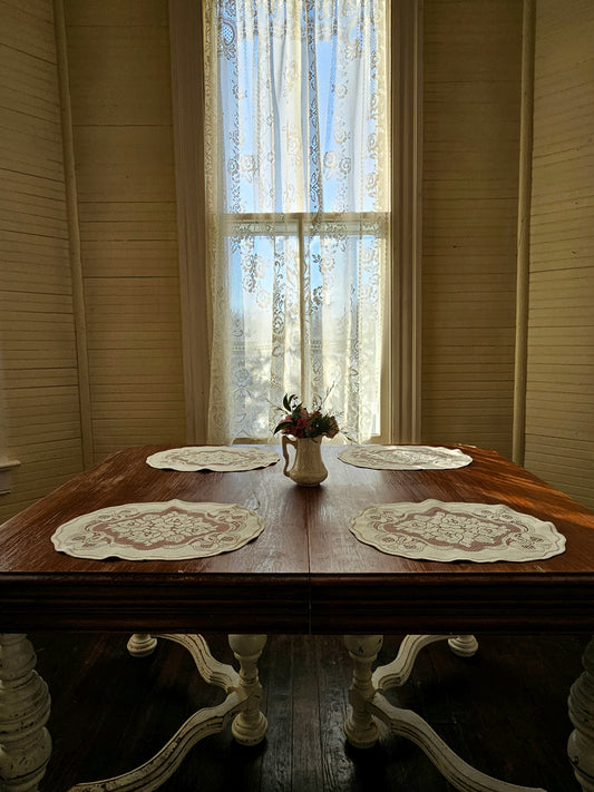 Vintage placemats set of 4 rose pink white lace oval scallop edge floral ribbon bow cottagecore shabby chic granny chic grandmillennial country farmhouse cottage style