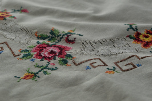 Vintage tablecloth handmade embroidered cross stitch floral white pink green brown multi colored square table topper small romantic feminine cottagecore Victorian style country farmhouse granny chic shabby chic