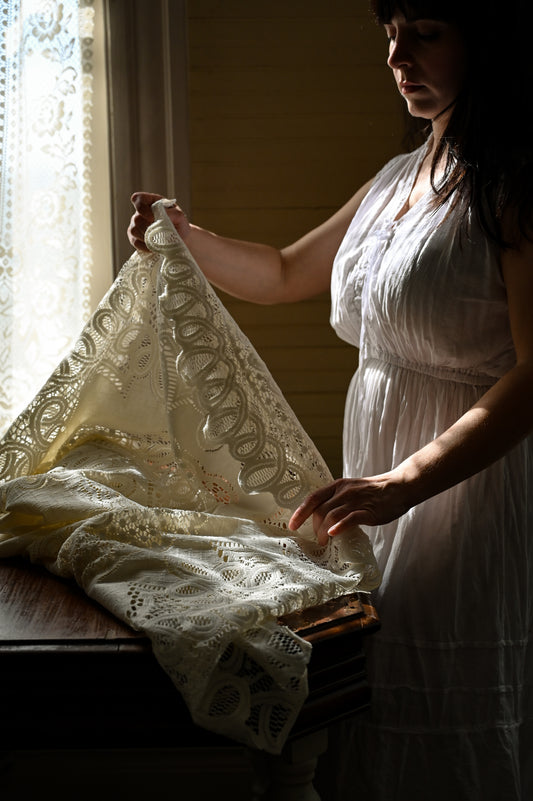 Vintage tablecloth, lace white paisley floral circle scallop edge country farmhouse cottagecore granny shabby chic
