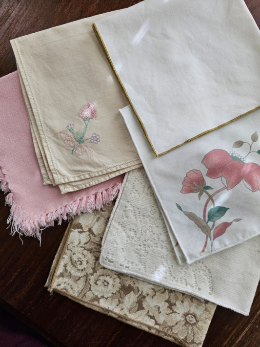 Vintage napkins set of 6 square mismatched color coordinated pink floral lace embroidered cottagecore whimsical country farmhouse charming granny chic shabby chic