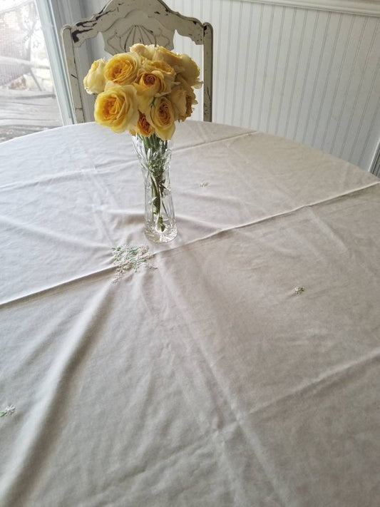 SALE Vintage tablecloth, embroidered, handmade, white, spring, floral, flowers, lace trim, square, neutral, minimal, shabby chic, granny chic