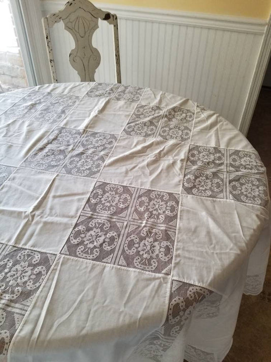 SALE Vintage tablecloth, white, lace, oval, oblong, patchwork, floral, lace, trim, granny chic, shabby chic, country, cottage, table linen, large