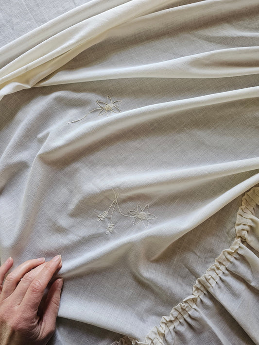 Vintage tablecloth, white circle ruffle pleated 80s 90s embroidered floral cottagecore country farmhouse shabby granny chic simple minimal