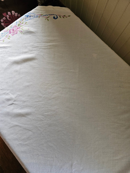 Vintage tablecloth, muted dusty pink embroidered square floral crochet trim scallop edge cottagecore Victorian grandmillennial granny shabby