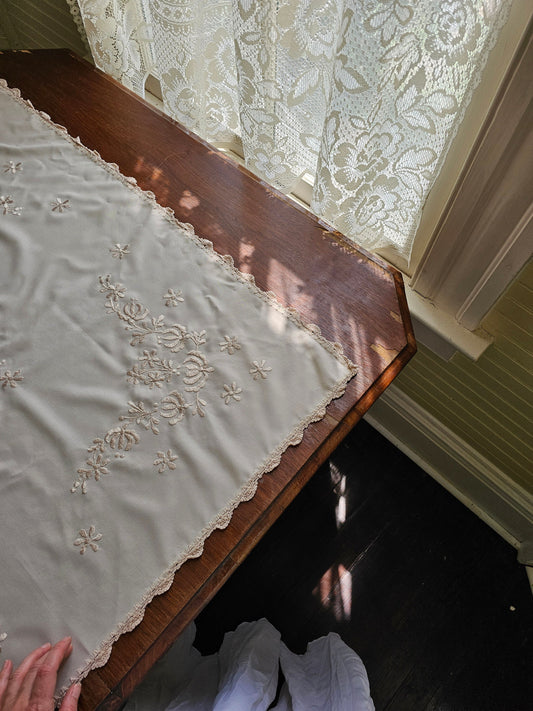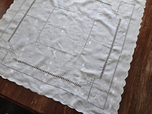 Vintage tablecloth, small square topper handmade embroidered floral white scallop cottagecore Victorian granny shabby chic country farmhouse