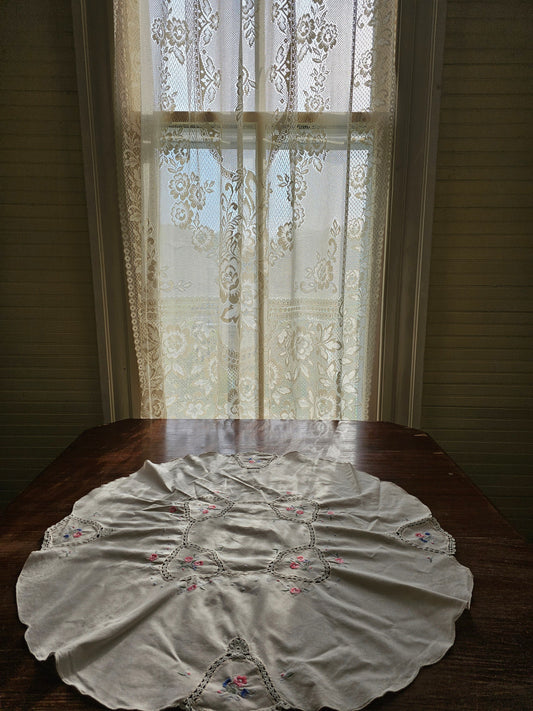 Vintage tablecloth, round topper embroidered floral scallop beige pink crochet lace granny shabby chic cottagecore country farmhouse small