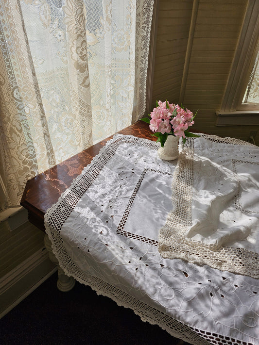 Vintage tablecloth, white square crochet embroidered floral cutwork lace small cotton granny grandmillennial Victorian country farmhouse