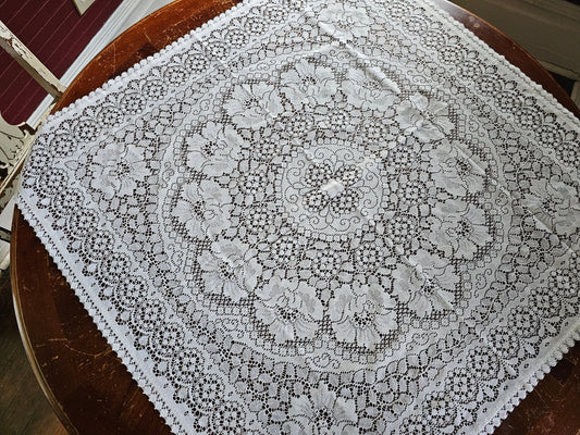 SALE Vintage tablecloth, lace, topper, small, square, off white, floral, rose, granny chic, shabby chic, cottage core, table linen, romantic
