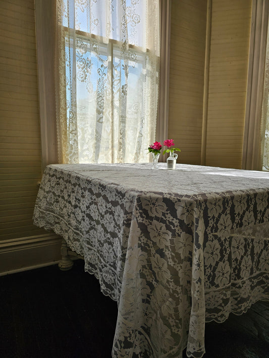 Vintage tablecloth, JCPenney white lace floral trim rectangle large cottagecore country farmhouse granny shabby Victorian grandmillennial