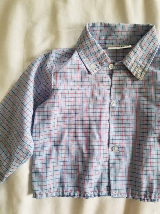 SALE Vintage Baby Button Down Shirt / Petit Jouet / Long Sleeve Shirt / Collared Shirt / Blue Plaid / Stripes / 3-6 months / Red Line