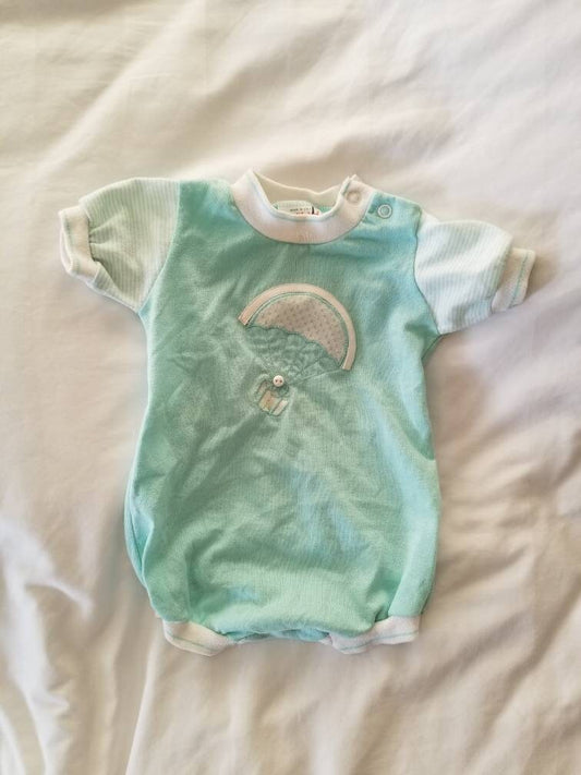 SALE Vintage Infant Bodysuit / Health-tex / 18 mos. / Teal Baby Sunsuit / Parachute Applique / Gender Neutral / Cotton Knit / Short Sleeves
