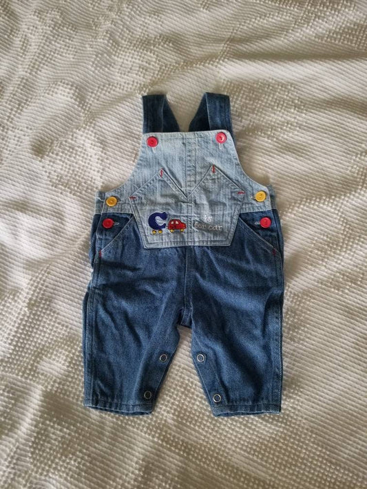 SALE Vintage infant overalls, 0-3 mos, denim, c is for car, crotch snaps, red, yellow, embroidered, 80s, kawaii, gender neutral, primary colors
